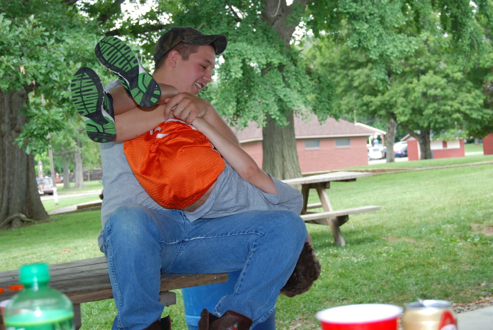 What you cannot see in this picture is Dustin is holding Payton down so Riley can pour a bottle of cold water on him. Notice that her hair is wet.... he got her first and now she is getting even! |